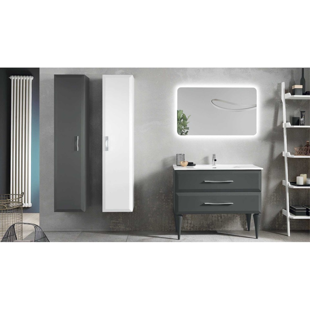 Finitura in MDF laccato, cassetti in truciolare rivestiti in PVC, chiusura rallentata con guida ad estrazione totale emuca, maniglie in zama cromo.