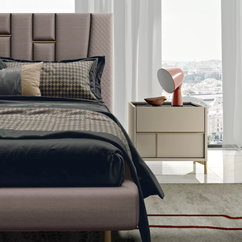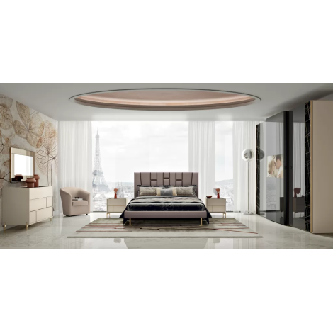 Letto: Struttura solida e imbottita, con testiera elegante e comoda per sostenere la lettura o il relax.