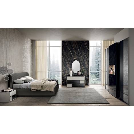 Scopri l'eleganza moderna della camera da letto Spar: letto imbottito, armadi spaziosi e comodini eleganti. Comfort e stile si uniscono in un'oasi di relax.