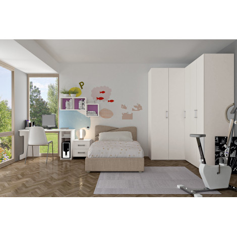 La cameretta Fawn si presenta: Armadio angolare in finitura bianco opaco, letto imbottito contenitore piazza e mezza, comodino a due cassetti con ruote e scrivania con top sagomato. Misure: Armadio L:159 cm x 206 cm H:242 cm Scrivania: L:120 cm P:62 cm Letto: L:130 cm P:220 cm
